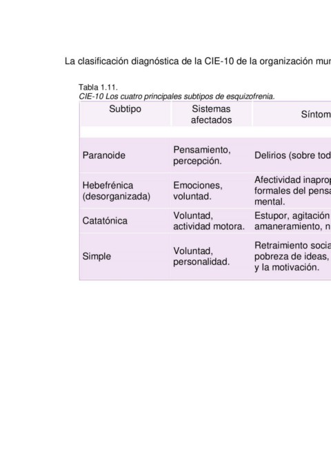 La clasificación diagnóstica de la CIE-10 de la organización mundial de la salud se establece en la Tabla 1.11.